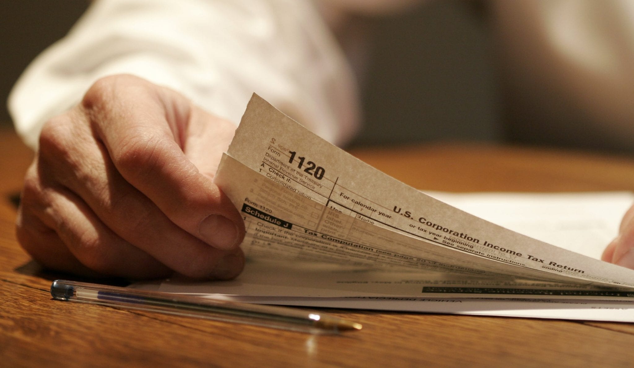 Stock photo of a man reviewing tax returns at his kitchen table.