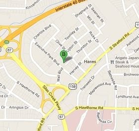 Road map showing the location for Lewis and Keller Attorneys at Law’s Winston-Salem, North Carolina office.